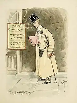 The paper was founded in 1865[1] by John Corlett, of Charlton Court, East Sutton, Kent, who was both its editor and its proprietor, and by Dr Joseph Henry Shorthouse.[2] Corlett also wrote a column in the paper called 'Our Note Book' and was associated with it from 1865 to 1913.[3][4] The Sporting Times was published on a Saturday, and its competitors included The Field, The Sportsman, the Sporting Life, and Bell's Life in London.[5] According to Alexander Andrews's Chapters in the History of British Journalism, the paper thrived "less upon its racing news than upon its profusion of coarse and scurrilous scraps of tittle-tattle, representing 'society journalism' in its most degraded form".[1]