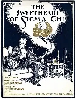 Often called the most beloved and popular of college fraternity songs, "The Sweetheart of Sigma Chi" was written in 1911[1] by Byron D. Stokes (Albion Class of 1913) and F. Dudleigh Vernor (Albion Class of 1914). Stokes had written the words while in class one June day that year, and presented them that afternoon to Vernor, who was practicing the piano in a local house, and composed the music at that time. The song has since become a favorite among ballroom orchestras and was used in two movie musicals of the same name, in 1933 and 1946. When asked about the song's inspiration, Stokes replied, "The 'Sweetheart' is the symbol for the spiritual ingredient in brotherhood. It was the Sigma Chi fraternity itself that inspired the song. I wrote the words not long after my initiation, and the magic of our Ritual with its poetic overtones and undertones was, I suppose, the source of my inspiration". The manuscript of the song remained on campus until 2007 when it was lost and not recovered.