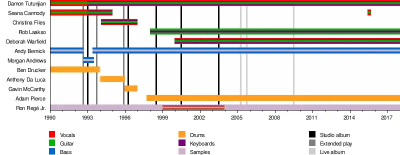 The band began to settle into being an outfit with a cast of guest musicians revolving in and out of the group to accommodate the other members' academic, career, and family commitments: Seana Carmody, Vanessa Downing, and Damon's sister Kara Tutunjian often joined onstage for live vocals, Mike Walker and Tarquin Katis occasionally sat in for Bernick on bass, and Ken Bernard and Kevin Shea sometimes replaced Adam Pierce on drums. Deborah Warfield joined the band as vocalist circa 2000, also playing guitar and keyboards live.