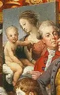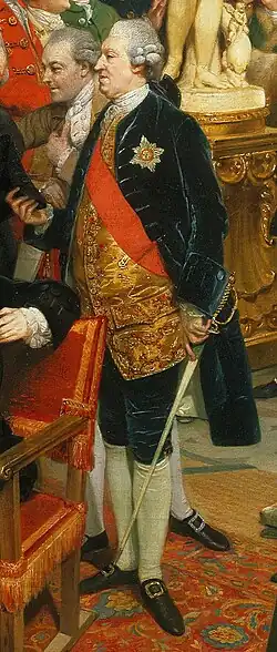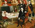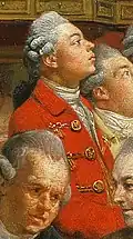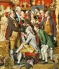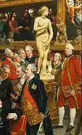 Beginning in 1764, the German-born painter Johan Zoffany received numerous commissions from the Hanoverian King George III and his consort, Queen Charlotte. The queen ordered Zoffany to paint "the Florence Gallery" (the Galleria degli Uffizi), for which the artist would be paid £300.[1] In the summer of 1772, Zoffany left London for Florence, where he met Felton Hervey, an art collector and friend of the king and queen, who figures prominently in the painting.[2] Zoffany worked on the painting through late 1777 and returned to England in 1779.[1] By this time Hervey had died.[2] It was submitted to the Royal Academy Exhibition of 1780 at Somerset House.