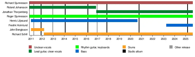 Following recent shows without co-frontman and guitarist Roland Johansson, the band posted a new music video on YouTube titled Nighttaker which briefly showed Johansson but also a new vocalist, Jonathan Thorpenberg.[26] The following day on 10 December 2016, the band released an official statement on Social media, announcing the departure of Roland Johansson who had been a member since the band's formation six years ago. He left because of increasingly growing commitments to touring and recording, which were having a negative impact on his personal life.[27]