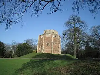 Sitting in the centre of The Walks is the Red Mount chapel, also known as 'Our Lady's Chapel' it is a Grade I listed building.[2] It was built in the 15th century to contain a relic of the Virgin, but was also used by pilgrims on their way to Walsingham.[3] It was built by Robert Corraunce on instructions from the Prior of Lynn. The inner core is divided into 3 storeys and there is an additional cross-shaped ashlar building in Ancaster stone on top.[4] The Red Mount was the subject of a painting by Thomas Baines.[5]