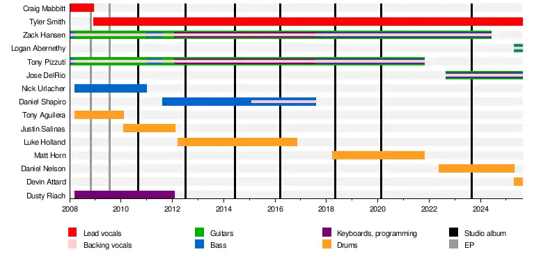 During February the band reached an agreement to leave founding drummer, Tony Aguilera out of the group.[17] Both parties (Aguilera and the rest of the band) shared their concerns and reasoning for the matter publicly. It was overall described that the band wanted to pursue a different percussionist of alternate talent than the founding member. Aguilera was replaced with Justin Salinas, who was previously a part of the bands Scars of Tomorrow and Catherine as well as serving as a past live drummer for MyChildren MyBride.[18]