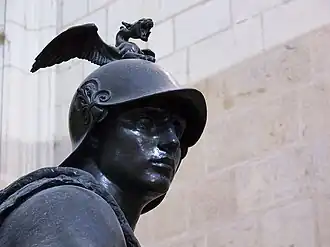 | Equestrian statue of Joan of Arc | Paris | This statue by Dubois is located in Paris' place Saint- Augustin.[16] There is a bronze version cast by Bingen in front of Reims cathedral and another in Washington cast by Rudier. There were several limited editions of the work cast by various foundries so the piece is very well known. There is also a copy of this statue in Strasbourg, this cast by the founders E.Gruet Jne. It is located in the place Arnold in Strasbourg. The plaster version was submitted to the Paris Salon in 1889 and this is held by the Musée Paul Dubois-Alfred Boucher. Several Dubois sketches of the proposed work are held in the Louvre and models are held in the Musée des Beaux-arts, Troyes and Ny Carlsberg Glyptothek in Copenhagen.[17] | |