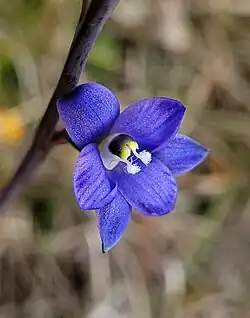 Thelymitra adorata, commonly called the Wyong sun orchid[2] or praying sun orchid,[3] is a species of orchid that is endemic to a very small area of New South Wales. It has a single relatively large, erect, fleshy, channelled leaf and up to thirteen deep blue, self-pollinating flowers.