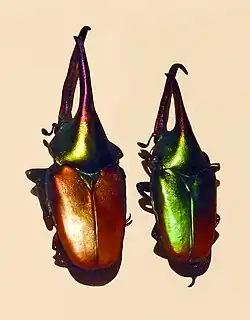Theodosia viridiaurata can reach a length of 38–52 millimetres (1.5–2.0 in). The basic colour of the body is metallic green, but the elytra may be coppery or golden coloured. These scarab beetles bear a long lower horn and a second long horn on the pronotum. These impressive horns are usually reddish or purplish.