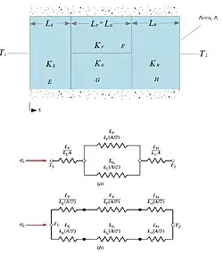 It is often suitable to assume one-dimensional conditions, although the heat flow is multidimensional. Now, two different circuits may be used for this case. For case (a) (shown in picture), we presume isothermal surfaces for those normal to the x- direction, whereas for case (b) we presume adiabatic surfaces parallel to the x- direction. We may obtain different results for the total resistance and the actual corresponding values of the heat transfer are bracketed by . When the multidimensional effects becomes more significant, these differences are increased with increasing .[9]