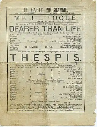 With the piece set to open on 26 December,[35] Gilbert first read the libretto to the cast on 14 December,[34] but Toole, who was playing the central role of Thespis, did not return from a tour of the British provinces until 18 December. He then appeared in nine performances at the Gaiety in the six days immediately after his return, and other actors had similar commitments. In addition, Hollingshead had committed the company to perform a pantomime at The Crystal Palace on 21 December, which included many of the performers who would be in Thespis. Lastly, Thespis was to play as the afterpiece to an H. J. Byron comedy, Dearer than Life, which shared many of its actors, including Toole and Fred Sullivan, and had to be rehearsed at the same time.[36]