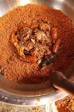 The popular West African dish known as jollof is thought to have originated from the thieboudienne, but is usually made with meat rather than fish, and the rice is mixed into the other ingredients.[6]