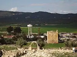 Thignica's stone ruins are called Aïn Tounga, located southwest of Testour, Tunisia. They are very extensive and cover the summit and slopes of a series of hills. One inscription calls the town "Civitas Thignicensis" (the city of Thignica) and states that it was divided into three parts, another that it became a municipium at the beginning of the 3rd century under the name of "municipium Septimium Aurelium Antoninianum Herculeum Frugiferum Thignica". Towards the centre of the ruins is a Byzantine fortress, trapezoidal in shape, flanked by five square towers. Here an inscription makes mention of the proconsul Domitius Zenophilus (326-32), famous in the annals of Christian Africa. Among the other ruins are a small triumphal arch, a temple, a Christian church, the remains of the enclosure, etc.,[1] as well as an amphitheatre.
