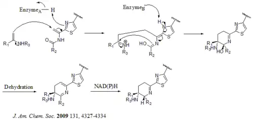- ^ Liao R, Duan L, Lei C, Pan H, Ding Y, Zhang Q, Chen D, Shen B, Yu Y, Liu W (2009). "Thiopeptide biosynthesis featuring ribosomally synthesized precursor peptides and conserved posttranslational modifications". Chem. Biol. 16 (2): 141–7. doi:10.1016/j.chembiol.2009.01.007. PMC 2676563. PMID 19246004.