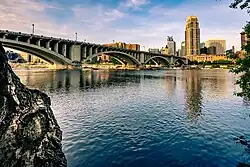 The Third Avenue Bridge is a landmark structure of the city of Minneapolis, Minnesota, United States, originally known as the St. Anthony Falls Bridge. It carries road traffic across the Mississippi River and upper fringes of Saint Anthony Falls. The multi-arched bridge meets with Third Avenue in downtown Minneapolis at its south end, but curves as it crosses the river, and connects with Central Avenue on its north end. The shallow "S" curve in the bridge was built to avoid fractures in the limestone bedrock that supports the bridge piers. The road is also designated Minnesota State Highway 65. Construction began in 1914, and it opened four years later in 1918.[1] The bridge, which uses Melan arches of an open spandrel design, has been modified since that time. The 2,223-foot (667.6 m) crossing was designed by city engineer Frederick W. Cappelen, who also created plans for other similar bridges in Minneapolis such as the Franklin Avenue Bridge. It cost US$862,254.00 at the time of construction.[1]