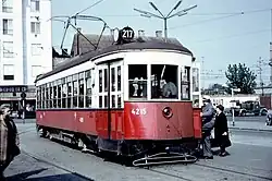 After the system's abandonment, 42 cars of the largest and newest type, built by TARS itself in 1938–1939 (on Brill trucks), were sold to the operator of the Vienna, Austria, streetcar system, Wiener Stadtwerke Verkehrsbetriebe (now Wiener Linien), for operation there.[11] They were renumbered, designated Vienna type "Z" and fitted with pantographs in place of their trolley poles. They did not use conduit current collection in Vienna. They entered service there in 1949–1950, exclusively on the 17/217/317 single track suburban service to Gross-Enzersdorf.[12] They were too wide to run on double track city lines. They were retired in 1969 when track brakes became mandatory.[11]