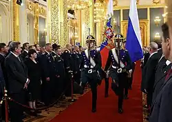 At the beginning of the ceremony Kremlin Regiment soldiers carried the flag of Russia, flag of the Russian president, Constitution of Russia and sign of the president of Russia.