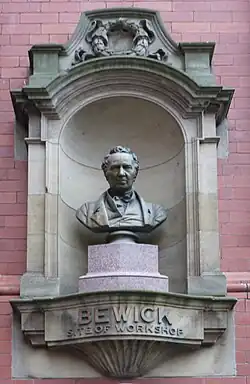 There are numerous portraits of Bewick.[59] In 1825, the Literary and Philosophical Society commissioned Edward Hodges Baily to sculpt a marble portrait bust of Bewick; there are several copies beside the one still at the Society itself. According to Uglow, when Bewick came to sit for the sculptor, he "stoutly refused to be portrayed in a toga. Instead he wore his ordinary coat and waistcoat with neckcloth and ruffled shirt, and even asked for some of his smallpox scars to be shown." Baily was so taken with him that he presented Bewick with a plaster model of the finished bust.[60] A bronze copy now rests in a niche of the building that replaced his workshop in the churchyard of Saint Nicholas (see above) and still another is at the British Museum.[61] There is also a full-length statue of him at the top left of the former chemist's shop designed by M.V.Treleaven at 45 Northumberland Street in the city.[62]