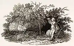 Bewick made use of his close observation of nature, his remarkable visual memory, and his sharp eyesight to create accurate and extremely small details in his wood engravings, which proved to be both a strength and a weakness. If properly printed and closely examined, his prints could be seen to convey subtle clues to the character of his natural subjects, with humour and feeling.[36] This was achieved by carefully varying the depth of the engraved grooves to provide actual greys, not only black and white, as well as the pattern of the marks to provide texture.[37] But this subtlety of engraving created a serious technical difficulty for his printers; they needed to ink his blocks with just the right amount of ink, mixed so as to be of exactly the right thickness, and to press the block to the paper slowly and carefully, to obtain a result that would satisfy Bewick. This made printing slow and expensive. It also created a problem for Bewick's readers; if they lacked his excellent eyesight, they needed a magnifying glass to study his prints, especially the miniature tail-pieces. But the effect was transformative, and wood engraving became the main method of illustrating books for a century.[37] The quality of Bewick's engravings attracted a far wider readership to his books than he had expected: his Fables and Quadrupeds were at the outset intended for children.[38]