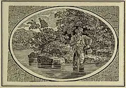 Bewick sometimes used his fingerprint as a form of signature,[53] (accompanied by the words "Thomas Bewick his mark"), as well as engraving it in one of his tail-pieces as if it had clouded the tiny image of a rustic scene with a cottage by mistake. Uglow notes one critic's suggestion that Bewick may have meant we are looking at the scene through a playfully smudged window, as well as drawing our attention to Bewick, the maker.[54] Adrian Searle, writing in The Guardian, describes the tiny work as "A visual equivalent to the sorts of authorial gags Laurence Sterne played in Tristram Shandy, it is a marvellous, timeless, magical joke."[51]