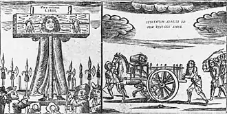 The publication of his Narrative led, once public opinion had turned against the informers, to his trial for libel (Kenyon notes that he could not as the law stood be tried for perjury, as no-one had actually been convicted on his evidence).[6] Dangerfield went into hiding in 1684 as soon as he heard about the threatened trial, but when James succeeded as King in February 1685 the new Government made a determined search for him and found him. He was tried and speedily convicted. On 20 June 1685 he received his sentence, which was to stand in the pillory on two consecutive days, be whipped from Aldgate to Newgate, and two days later from Newgate to Tyburn.[6]