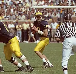In the 1999 season, Brady had to hold off Henson again for the starting job. They platooned during the first seven games, with Brady playing the first quarter, Henson second, and Carr deciding upon a quarterback for the second half. The 1999 Wolverines started with a 5–0 record, including a 26–22 win over Notre Dame, and a road win against eventual powerhouse Wisconsin.[61] Against Michigan State, Brady was not chosen to play the second half; however, after being reinserted with Michigan down by 17 points, he nearly led Michigan all the way back before losing 34–31.[62] After a 300-yard passing game the following week, Carr went exclusively with Brady for the remainder of the season. On October 30 against Indiana, Brady played the entire game for the first time in the season and threw for 226 yards, his fifth straight game throwing for 200 yards, to lead Michigan in a 34–31 win.[63] Against Penn State, Brady led Michigan to another 4th-quarter comeback in a 31–27 win, heading into the regular season's final game as winners of three straight.[64]