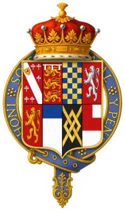 He was created Knight of the Garter in 1611. In 1613 he escorted Elizabeth, the electress consort Palatine, to Heidelberg as part of her marriage celebrations, and again visited Italy. On Christmas Day 1616 he took communion in a Church of England service, seen as a true test of his conformity,[4] having been appointed a Privy Councillor in July 1616 [5] He supported Sir Walter Raleigh's expedition to Guiana in 1617, became a member of the New England Plantations Committee in 1620 and planned the colonization of Madagascar.