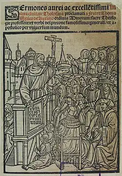 Thomas was also famed for his prophecies. In 1521, he preached in Toulouse a coming disaster for the church.[12] In 1526, he preached in Bordeaux in Gascon, his words later being seen as predicting the Wars of Religion.[13] A set of eleven pamphlets claiming to be his prophecies was published at Paris in 1520 and again in 1530 under the title Copie de la prophetie faicte par le pauvre frere Thomas souverain exclamateur de la parolle de Dieu nouvellement translatée de ytalien en francoys.[5][13][14] In 1524, Thomas preached a sermon against Martin Luther, which was translated into French by Nicolas Volcyr de Serrouville and published at Paris the following year as Sermon de charité avec les probations des erreurs de Luther.[5][15] He saw Luther as sent by God as punishment for men's sins, but prophesied that a "sword of fury" was still to come.[15]