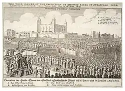 Strafford met his fate two days later on Tower Hill, receiving the blessing of Archbishop Laud (who went on to be likewise imprisoned in the Tower, and executed on 10 January 1645).[44] He was executed before a crowd estimated, probably with some exaggeration, at 300,000 on 12 May 1641 (as this number was roughly the population of London at the time, the crowd is likely to have been a good deal smaller).[45] As the common hangman of London, Richard Brandon carried out Strafford's execution, and incidentally also of Archbishop Laud in January 1645.[46]