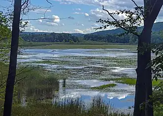 Thompson Pond in Pine Plains, New York is a 75-acre (30 ha) 15,000-year-old glacial kettle pond at the foot of 1,403-foot (428 m) Stissing Mountain. It is the source of Wappinger Creek, a tributary of the Hudson River that drains much of Dutchess County.