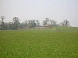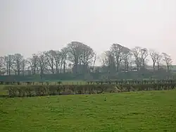 Thomson's map of 1828 gives some detail, showing two entrances and driveways, with substantial woodlands and an enclosed park on the Springside boundary, as used for deer or cattle. He also marks the name 'Mains', indicating the home farm, apparently situated to the right of the house on the 'east' driveway on the Crosshouse side.[9] This was later rebuilt above the 'West' Lodge (1898 OS), however buildings remain in the 'old' site up until the time of the 1921-28 OS map. This map also indicates a building roughly in the centre of the walled garden. The walls show no signs of typical conservatory-style greenhouses built against them, so this may be a large 'greenhouse'. The stone is red sandstone with freestone corners and coping stones. The materials were landed at Troon harbour and brought here by cart. A 'trig point' is carved on the corner of the walled garden nearest the old quarry.[10] A well is shown near the walled garden in the vicinity of the modern housing. An old freestone quarry is shown on the 1860 map, close to the trig point on the walled garden. Buildings are indicated on the 1912 OS map as lying fairy close to the northern wall of the walled gardens. Only vague foundations and scattered stones now exist at the site in 2007.