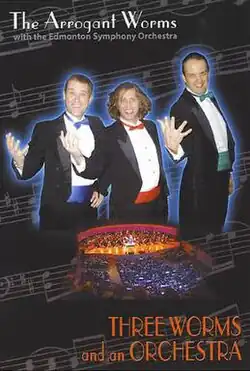 Three Worms and an Orchestra is a DVD of a performance of the Canadian comedy music group The Arrogant Worms with the Edmonton Symphony Orchestra. It includes their most popular songs performed live, as well as two music videos. Prior to the show, the group met with the symphony for a single practice session together.[1] Filming of the concert by Aidan Cosgrave, the group's friend, happened in January 2002 at Winspear Centre.[1][2]