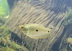 The three spot gourami (Trichopodus trichopterus), also known as the opaline gourami, blue gourami, and gold gourami, is a species of fish native to southeastern Asia, but also introduced elsewhere.[1] This gourami gets its name from the two spots along each side of its body in line with the eye, considered the third spot.[3] This species is of minor commercial importance as a food fish in its native range and is also farmed. It is also popular in the aquarium trade.[2] The species reaches 15 cm (5.9 inches) in standard length.[2]