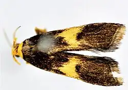Meyrick described Thubana xanthoteles on the basis of two female specimens and described Thubana melitopyga from one female specimen. John Frederick Gates Clarke regarded Thubana melitopyga as a junior synonym of Thubana xanthoteles. Kyu-Tek Park described Thubana stenosis on the basis of specimens collected from north Thailand, which bears a "golden yellow bandlike costal patch" on the forewing. He also noticed that the female genitalia of Thubana stenosis are hardly distinguishable from those of Thubana xanthoteles. Later study concluded that the male genitalia of the three specimens collected in south Yunnan undoubtedly match with those of Thubana stenosis described by Park, and the female genitalia match with those of Thubana stenosis and of Thubana xanthoteles.[1]