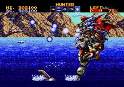 Some enemies will drop power-ups that if picked up by the player will arm the ship with new weaponry, including a variety of missiles and lasers that fire in different patterns.[4] Each weapon has advantages and drawbacks, and is more or less effective depending on the battle situation the player finds themselves in.[1] The player can hold multiple weapons and cycle through them at will.[3] Other power-ups include shields and satellite ships that revolve around their ship and multiply their firepower.[2][5] Half-way through the game, the player gains a powerful "Thunder Sword" attack which deals massive damage to enemies. It requires that the player have two satellite ships.[1]