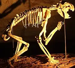 Its strong forelimbs and retracting claws mean that Thylacoleo possibly climbed trees and perhaps carried carcasses to keep the kill for itself (similar to the leopard today).[29] The climbing ability would have also helped them climb out of caves, which could therefore have been used as dens to rear their young.[30] Specialised tail bones called chevrons strengthened the tail, likely allowing the animal to use it to prop itself up while rearing on its hind legs, which may have been done when climbing or attacking prey.[30]