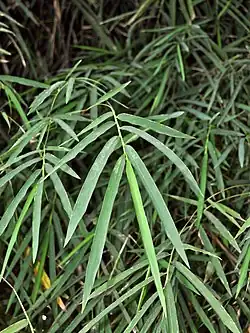 Thyrsostachys siamensis is one of two bamboo species belonging to the genus Thyrsostachys. It grows up to 7 to 13m tall. It is native to Yunnan, Myanmar, Laos, Thailand, Vietnam and naturalised in Sri Lanka, Bangladesh, Malaysia. The plant is also known as long-sheath bamboo, monastery bamboo, Thai bamboo, Thai umbrella bamboo, umbrella bamboo, and umbrella-handle bamboo.