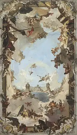 He also painted two other ceilings in the palace, and carried out many private commissions in Spain.[19] However, he suffered from the jealousy and the bitter opposition of the rising champion of Neoclassicism, Anton Raphael Mengs; at the instigation of Mengs' supporter, the King's confessor Joaquim de Electa, had Tiepolo's series of canvases for the church of San Pascual at Aranjuez replaced by works by his favourite.[19]