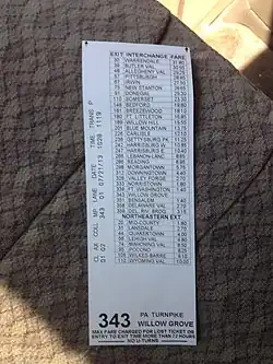 First employed on the Pennsylvania Turnpike when it opened in 1940,[3] the ticket system has been utilized on lengthy toll highways in which the exits are spread out over a distance on an average of 7 to 10 miles (11 to 16 km) per exit.