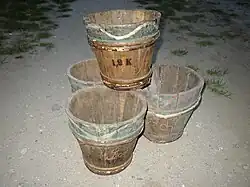 Three coopers worked on the island and it is to be supposed that the cooper's trade began in the 18th century in Werder. Before the Tienen were sold to the fruit farmers, the coopers had to calibrate them. The Tienen were dried and then weighed and the dead weight was branded on the outside. A new Tiene for cherries with a capacity of 7 to 9 pounds cost sixty pfennigs in 1908. A Tiene for raspberries weighed 50 to 60 pounds.