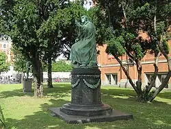 The garden strip along the Ny Carlsberg Glyptotek features a number of monuments and other artworks that faces the street. These include a statue of the archeologist Georg Zoëga by Ludvig Brandstrup. The monument is flanked by two statues by Constantin Meunier, The Harbour Worker (left) and The Sower /right). A little further down the street, on a narrow lawn in front of the museum's Hack Kampmann Wing, stands a vronze statue of a standing woman, Guapa, created by Gottfred Eickhoff in 1951.
