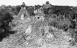 As is often the case with huge ancient ruins, knowledge of the site was never completely lost in the region. It seems that local people never forgot about Tikal and they guided Guatemalan expeditions to the ruins in the 1850s.[17] Some second- or third-hand accounts of Tikal appeared in print starting in the 17th century, continuing through the writings of John Lloyd Stephens in the early 19th century (Stephens and his illustrator Frederick Catherwood heard rumors of a lost city, with white building tops towering above the jungle, during their 1839–40 travels in the region). Because of the site's remoteness from modern towns, however, no explorers visited Tikal until Modesto Méndez and Ambrosio Tut, respectively the commissioner and the governor of Petén, visited it in 1848. Artist Eusebio Lara accompanied them and their account was published in Germany in 1853.[82] Several other expeditions came to further investigate, map, and photograph Tikal in the 19th century (including Alfred P. Maudslay in 1881–82) and the early 20th century. Pioneering archaeologists started to clear, map and record the ruins in the 1880s.[17]