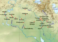 The site was inhabited as early as the Neolithic period with an important city, then called Abarsal, arising in Early Bronze III and being completely destroyed in EBIV.[2] It is the remains of the Iron Age city which is the most important settlement at Tell Ahmar. It was known in Hittite as Masuwari.[1][3] The city remained largely Neo-Hittite up to its conquest by the Neo-Assyrian Empire in the 856 BC and the Luwian language was used even after that.[4][5] Til Barsip was the capital of the Aramean-speaking Syro-Hittite state of Bît Adini. After being captured by the Assyrians from its previous king Ahuni,[6] the city was then renamed as Kar-Šulmānu-ašarēdu, after the Assyrian king Shalmaneser III, though its original name continued in use. It became a prominent center for the Assyrian administration of the region due to its strategic location at a crossing of the Euphrates river.