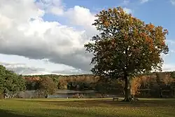To the east of the car park is a wooded area, containing a children's play area and "Go Ape". Downslope from this is the Main Lawn, running down to Tilgate Lake and the Watersports Centre. A path runs across the dam and down the east side of the lake to Silt Lake.[1]