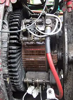 With the electrical generator (a large dynamo) for the motor permanently connected to the petrol engine, the early petrol electric controls available were a sprung return throttle pedal (with a hand-operated variable latching throttle to set and adjust the idle speed), a brake pedal, a means of steering (wheel, etc.) and two usually column mounted levers. One centre off lever operated a three position changeover switch to permit running in either direction, and the other lever operated a wiper across a bank of large high current wire wound resistances which affected the motor and dynamo fields, to give the electrical effect of gearing. It was very important to set the minimum possible idle speed, or when engaging the direction switch excess load on the system and possible unwanted movement will occur. The resistance "gear" lever is then set to max torque, and then the direction lever set to (say) forward. On releasing the handbrake and pressing the throttle pedal a little the vehicle will glide away smoothly. Giving more throttle and gradually altering the resistance lever will then produce higher speed, with none of the jerking and pauses in acceleration of a gearbox. To stop, the throttle pedal is released, the resistance lever is brought back to "slow speed", the brake applied and as rest is achieved the forward/reverse lever moved to neutral and handbrake applied. There is however NO engine braking available as from a mechanical drive changed into a lower gear, so the system relies totally on the mechanical wheel brakes, which on early chassis applied to the rear axle only.