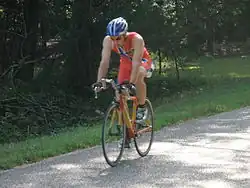 Time trials have been part of cycling for more than a hundred years. The first time trial was run in 1895 after a ban on road racing was imposed by the National Cyclists' Union. It wasn't until 1939 that the time trial made its world stage debut as an official stage of the Tour de France.[1] It was originally used as a method of drawing more people to listen to the Grand Tour on the newly available radio broadcast of the 1939 race.[1] The main thing that distinguished the first time-trial from the traditional form of road racing was that the riders started at intervals instead of one large group and they raced against the clock instead of each other.[2] Unlike road racing where the a rider can hang in the peloton and draft off of other riders to conserve energy, time trial races put the rider out alone on the course. There are no breaks and no one to draft off, causing a rider to push as hard as they can the entire race.[3] Bicycles have also evolved to accommodate this new form of racing, with most of the breakthroughs occurring in the last 40–50 years with the introduction of triathlons.