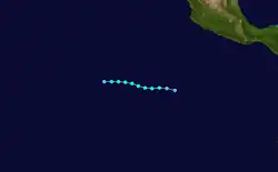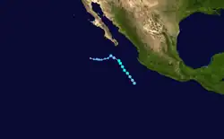 A tropical wave departed the western coast of Africa on June 23 and began steady organization after entering the eastern Pacific over a week later. The system acquired sufficient organization to be declared a tropical depression around 18:00 UTC on July 5 and embarked on a northwesterly course parallel to the coastline of Mexico. The following day, however, a weakening mid-level ridge to its north directed the cyclone more poleward.[15] Strong easterly wind shear prevented the formation of banding features while keeping the overall cloud pattern disorganized,[16] and the depression moved ashore near Lázaro Cárdenas, Michoacán, early on July 7 without attaining tropical storm intensity. It dissipated over the mountainous terrain a few hours later.[15]