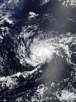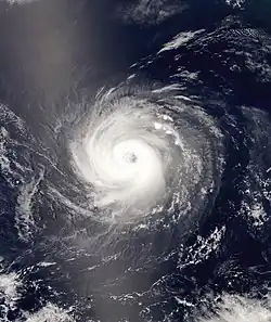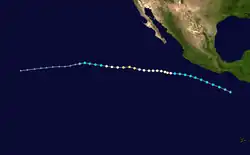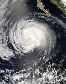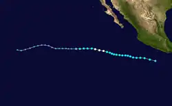 On July 24, a tropical wave exited the west coast of Africa, which traversed the Atlantic Ocean and eventually entered the eastern Pacific on August 2. There, it interacted with a broad area of cyclonic flow south of Mexico.[36] Its associated convection increased and organized around a low-pressure area.[37][38] On August 6, the NHC designated the system as Tropical Depression Nine-E about 775 mi (1,245 km) south-southwest of the southern tip of Baja California Sur. A ridge over Mexico steered the depression to the northwest and later in a general westward direction. On August 7, the NHC upgraded the depression to Tropical Storm Hernan.[36] Although Hernan was located over warm waters, moderate wind shear prevented the storm from intensifying quickly.[39] An eye feature formed as wind shear diminished, signaling that Hernan intensified into a hurricane on August 8.[40][41][42] After the eye became more defined, Hernan was upgraded to a major hurricane on August 9, reaching peak winds of 120 mph (195 km/h).[43][36]