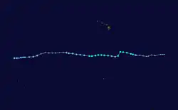 On the morning of August 5, the CPHC began monitoring an area of low pressure 1,200 mi (1,900 km) east-southeast of Hilo, Hawaii;[51] the system became better organized later in the day as the system was classified as a tropical disturbance[52] and was declared Tropical Depression One-C on August 7 850 mi (1,370 km) southeast of Hilo, Hawaii.[53] One-C was being steered toward the west due to easterly trade winds caused by large subtropical high-pressure area located northeast of Hawaii.[54] The depression was quickly upgraded to Tropical Storm Kika later that night.[55] Despite strong wind shear,[56] the storm was expected to attain winds at 60 mph (95 km/h).[57] However, this did not occur. After turning west-northwest and attaining peak intensity,[4] Kika became less organized the following morning and the CPHC subsequently downgraded it to a tropical depression.[58] After a revival in convection[59] Kika was re-upgraded to a tropical storm again that evening.[4] Even though wind shear was significantly diminishing, the storm became even less organized was moving over cooling water.[60] Late on August 9, Kika weakened to a tropical depression once more, but was briefly re-upgraded into a tropical storm as it became better organized very late that night.[61] By August 10, only isolated bursts of thunderstorms had remained around the center;[62] as such, Kika was downgraded into a tropical depression.[4] After a brief increase in thunderstorm activity, one Tropical cyclone forecast model showed Kika reaching hurricane status.[63] Kika degenerated into a remnant low-pressure area that night 400 mi (645 km) away from the Johnston Atoll.[4] The remnant low was last noted on August 14 as it crossed the International Date Line, out of the Central Pacific Hurricane Center's area of responsibility.[64]