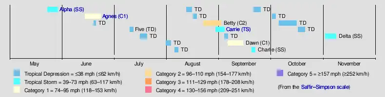 The 1972 Atlantic hurricane season was a cycle of the annual tropical cyclone season in the Atlantic Ocean in the Northern Hemisphere. It was a significantly below average season,[nb 1] having only four fully tropical named storms, the fewest since 1930.[2] It was one of only five Atlantic hurricane seasons since 1944 to have no major hurricanes,[nb 2] the others being 1968, 1986, 1994, and 2013. The season officially began on June 1, 1972 and ended on November 30, 1972. These dates, adopted by convention, historically describe the period in each year when most tropical systems form.[4] However, storm formation is possible at any time of the year, as demonstrated in 1972 by the formation of Subtropical Storm Alpha on May 23. The season's final storm, Subtropical Storm Delta, dissipated on November 7.