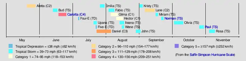| Carlotta | June 18 – 25 | Category 4 hurricane | 155 (250) | 932 | Southwestern Mexico, Northwestern Mexico | Minimal | 18 | |||