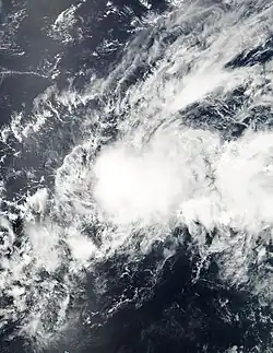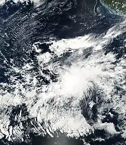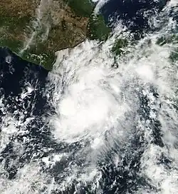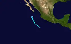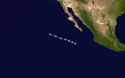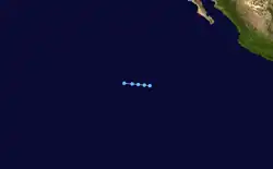 Tropical Depression Four-E formed from the same tropical wave that spawned Tropical Depression Two in the Atlantic Ocean. The tropical wave crossed Central America between June 30 and July 1, continuing to move westward into the Pacific Ocean. The wave became more organized on July 6 and the National Hurricane Center started issuing advisories on the newly developed tropical depression later that day.[10] The NHC initially predicted that the depression would reach tropical storm intensity, as there was a lack of vertical wind shear around the system and sea surface temperatures were warm enough for intensification to occur.[11] The depression lacked any deep convection, however, and it began weakening On July 7.[12] The depression entered an area of stronger wind shear and dissipated that day.[13]
