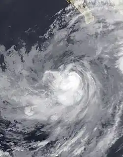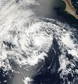 On July 11, a tropical wave moved off the African coast, and moved to the Lesser Antilles one week later. It passed over Central America near Panama on July 22 without any increase in organization. On July 25, the wave began to show curved banding, showing that it had become better organized. It intensified to a tropical depression on July 26 while located south southwest of Manzanillo, Mexico, designated as Tropical Depression Seven-E. The depression was upgraded to Tropical Storm Emilia later that day while moving northwest, steered by a mid-level ridge to its north.[21] During this time, Emilia was forecast to strengthen to a hurricane within two days, due to the system moving over warm waters.[22] However, late on July 27, the storm began to accelerate, meaning that it will move into cooler waters sooner than firstly anticipated, therefore, only allowing the storm to intensify within a few hours before weakening.[23] Emilia moved near Socorro Island and its intensity peaked with wind speeds of 65 mph (105 km/h), with an eyewall beginning to form. A few hours later, the storm moved into cooler waters and drier air, and Emilia's deep convection dissipated, weakening the storm.[21] Late on July 28 deep convection redeveloped near the storm's center, but wind shear prevented Emilia from strengthening.[24] It turned to the west and weakened below tropical storm intensity on July 29,[21] as the deep convection in the storm diminished again.[25] It shortly dissipated while located several hundred miles west south-west of Cabo San Lucas, Mexico.[21]